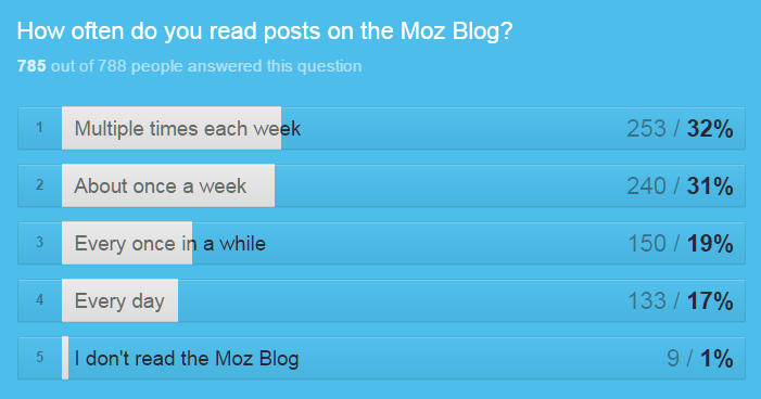 We asked in our most recent reader survey how often people generally read the Moz Blog, and 17% of readers reported that they read it every day.
