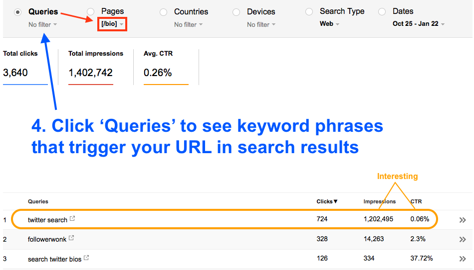 Here’s a picture of our traffic and search queries for Followerwonk. While it’s a good amount of traffic, something looks off with the second URL: it receives 10x more impressions than any other URL, but only gets a 0.25% click-through rate. We’ll use this URL for our process.