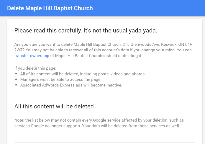 When you delete a local page, the corresponding listing will be unverified and you will no longer be able to manage it. Google may still retain business information from the page and may continue to show information about the business on Maps, Search, and other Google properties, including marking the business as permanently closed, moved, or open, depending on the information that’s known about the business.