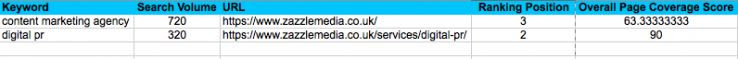 We start by adding our keywords to our spreadsheet alongside a capture of the search volume for those terms and the actual URL ranking, as shown below (NOTE: all data is for google.co.uk).