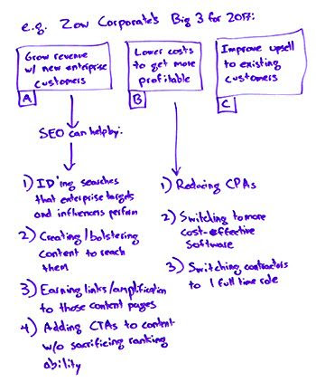 Here's Zow Corporate, the opposite of Moz, which is hopefully not very corporate. Zow Corporate's big three for 2017, they want to grow revenue with new enterprise customers, they want to lower their costs to get more profitable, and they want to improve their upsell to existing customers. So SEO can help with these things by — and this is a really smart framework — you want to take the things that your organization wants to accomplish at its executive or board level, and you want to show that SEO is actually doing those things, not just that you're trying to rank for keywords or bring more traffic, but that you've mapped your priorities in this way.