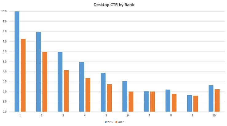 Looking at 2015 vs 2017 data for all keywords ranking organically on the first page, we’ve seen a dramatic change in CTR. Below we’ve normalized our actual CTR on a 1–10 scale, representing a total drop of 25% of click share on desktop and 55% on mobile.