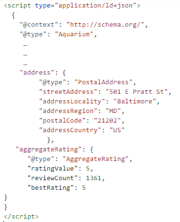 As an example, I’m going to walk through the Aquarium item type Schema.org markup. For illustrative purposes, I’m going to stick with JSON-LD moving forward; however, if there are any microdata questions, please reach out in the comments.